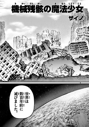 おもしろかった!ラストがスカッとしていい感じ!ただ、魔法少女が年を取らない事と、飯を食べなきゃいけない事を最初の方で描いて欲しかった。(石化してたから、それが解けて生き返ったと思ってたよ(笑)。)食事のシーンなかったし…人類が滅亡したのに何を食べてたんだろう? あと、ロボットのセリフはフキダシを変えるかセリフの書体を変えるかした方がいいと思うよ。
