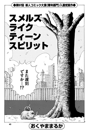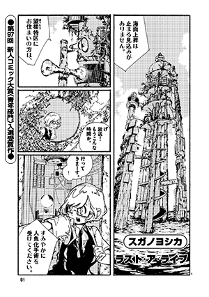 ティーンの淡い恋心を瑞々しいペンタッチで表現した非常に好みの作品でした。表現の特殊さゆえの読みづらさは多少ありますが、空気感は最高です。新人賞ではあまり見かけない性的なシーンが含まれますが、単純なエロではなく、行き場のない感情の切なさのような性的表現になっているので、むしろ爽やかさを感じました。どういった作家になりたいかが明確なので脇目も振らずその道を極めて欲しいです。